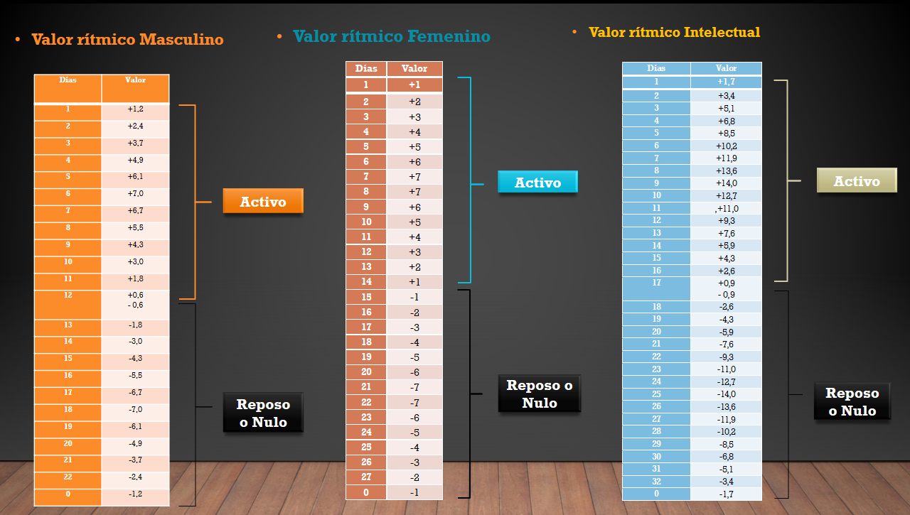 Uno de los enfoques que exploramos se basa en la teoría de los días y valores rítmicos, la cual encuentra su fundamento en el biorritmo humano. Estos biorritmos se dividen en tres categorías o ciclos claramente definidos: el ciclo físico o masculino, el ciclo emocional o femenino y el ciclo intelectual. Cada uno de estos ciclos presenta valores tanto positivos como negativos.